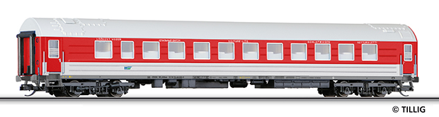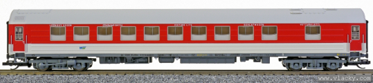 | lůžkový vůz červený-bílý se světle šedou střechou |