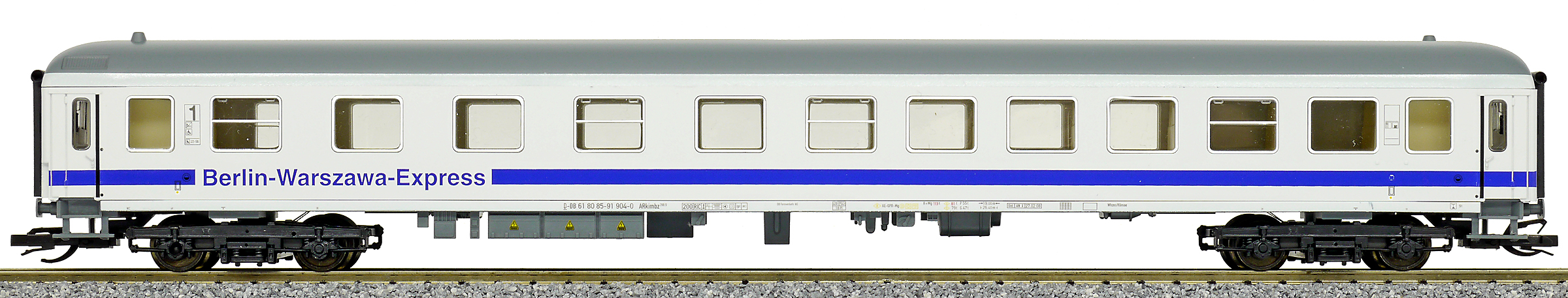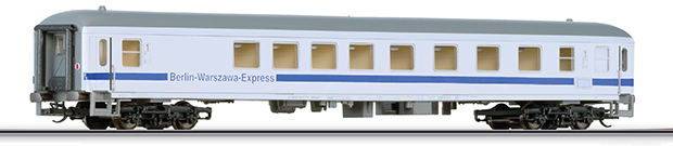 | rychlíkový vůz bílý s modrým pásem a šedou střechou 2. tř. „Berlin-Warszawa-Express“ |