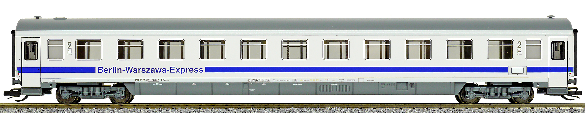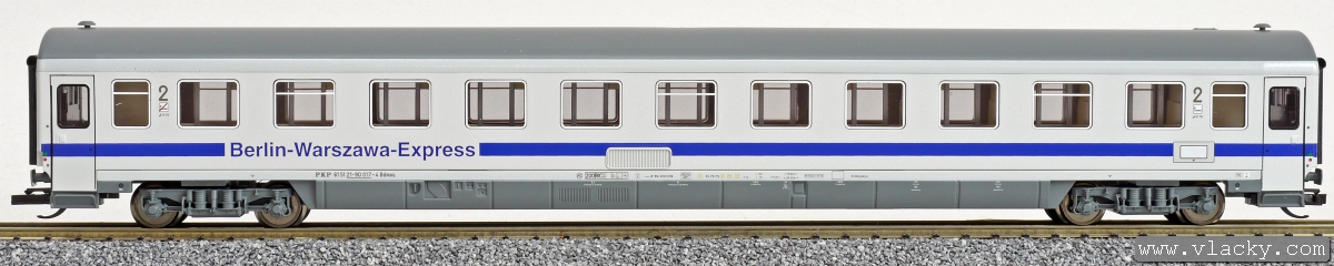 | rychlíkový vůz bílý s modrým pásem a šedou střechou 2. tř. „Berlin-Warszawa-Express“ |