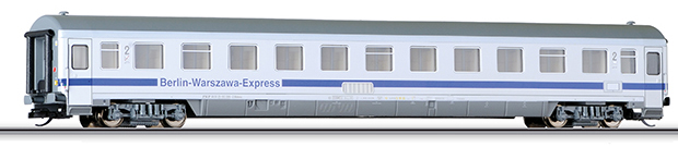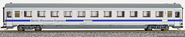 | rychlíkový vůz bílý s modrým pásem a šedou střechou 2. tř. „Berlin-Warszawa-Express“ |