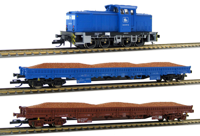 Popis   set lokomotivy BR 346 a dvou nízkostěnných vozů s nákladem štěrku „Pressni