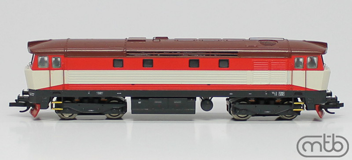 Popis   dieselová lokomotiva červená-slonová kost, červenohnědá střecha, černý rám a podvozky
