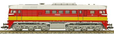 | dieselová lokomotiva červená se žlutým výstražným pruhem, šedá střecha a pojezd |