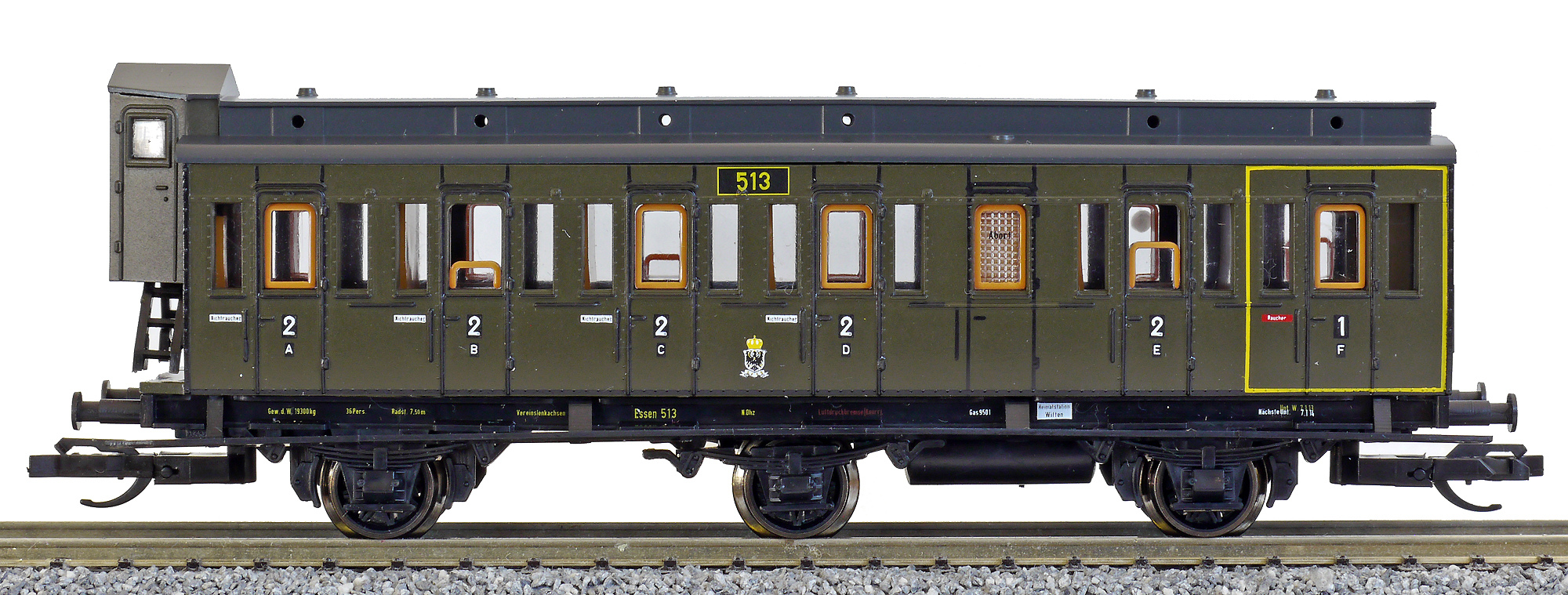 Popis   oddílový osobní vůz červenohnědý-zelený s černou střechou a brzdařskou budkou 2./3. tř.