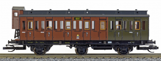 oddílový osobní vůz červenohnědý-zelený s černou střechou a brzdařskou budkou 2./3. tř.