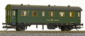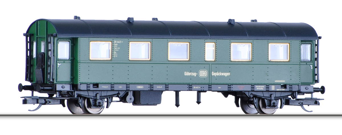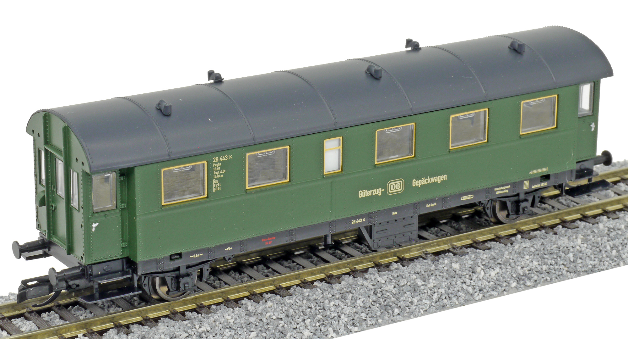 Popis   pomocný zavazadlový vůz do nákladního vlaku zelený s šedou střechou