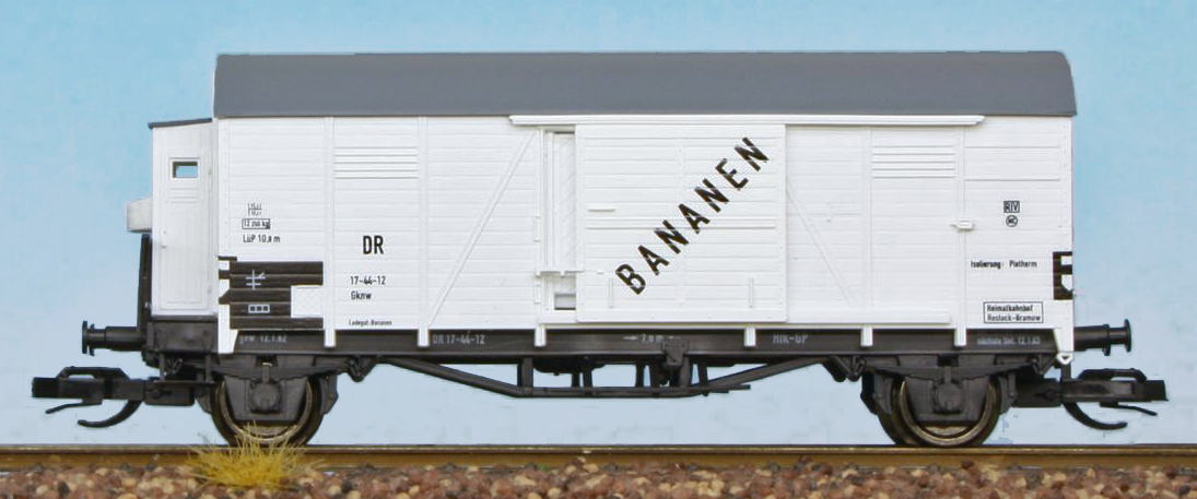 | bílý s šedou střechou a brzdařskou budkou „BANANEN“ |