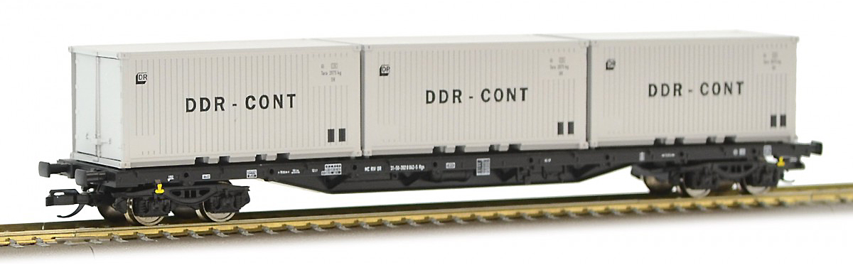 | nákladní plošinový vůz černý s nákladem tří kontejnerů „DDR-CONT“ |