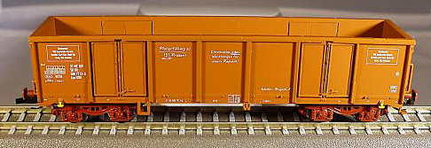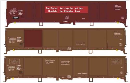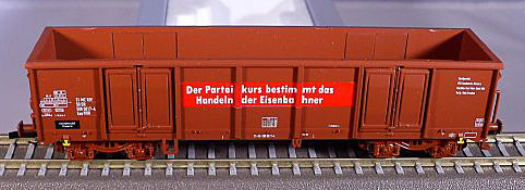 | vysokostěnný vůz červenohnědý s nápisem „Der Parteikurs bestimmt das Handeln der Eisenbahner“ |