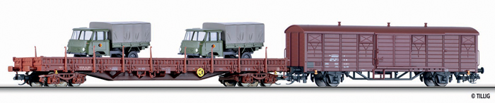 | nízkostěnný nákladní vůz červenohnědý s nákladem vojenských vozů „Militärtransport“ |
