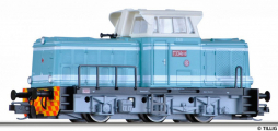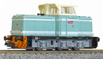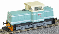 | dieselová lokomotiva tyrkysová s krémovou budkou, černý rám a šedý pojezd |