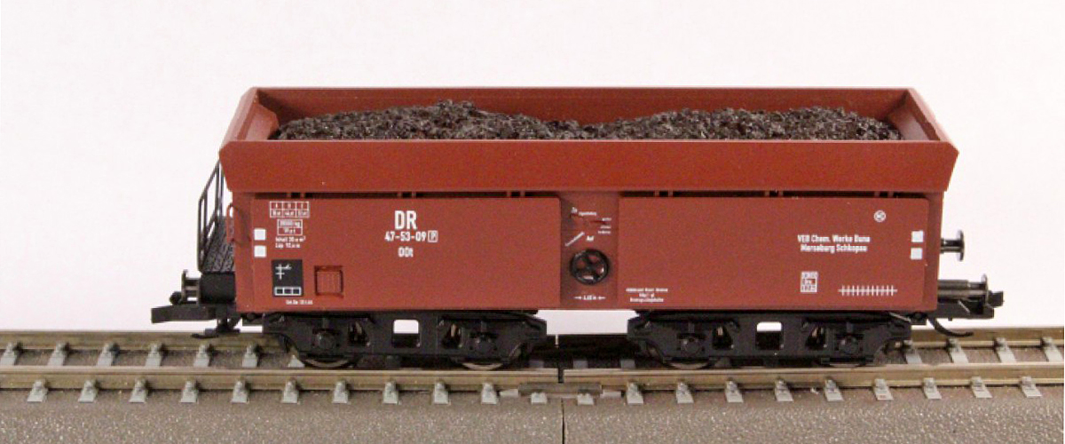 | nákladní samovýsypný vůz červenohnědý s nákladem hnědého uhlí |