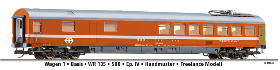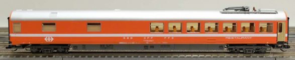 | jídelní vůz oranžový s šedou střechou a polopantografem |