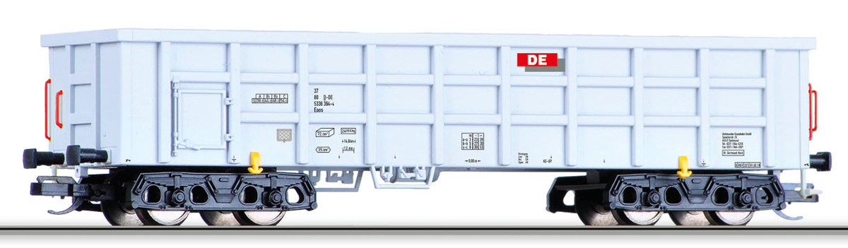 | vysokostěnný nákladní vůz světle šedý s červeným logem „Dortmunder Eisenbahn“ |
