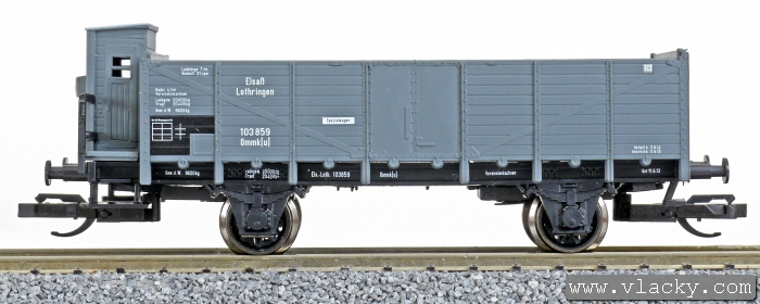 otevřený vůz šedý s loukoťovými koly a s brzdařskou budkou