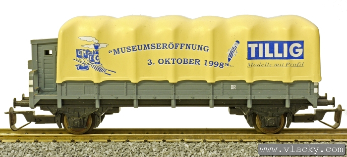 | nízkostěnný vůz šedý s plachtou s reklamním potiskem „Museumseröffnung“ |