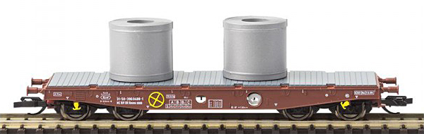 | plošinový vůz hnědý s nákladem dvou cívek |