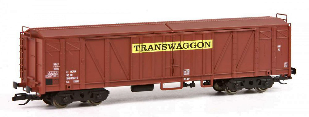 | krytý vůz červenohnědý s červenohnědou střechou „TRANSWAGGON“ |