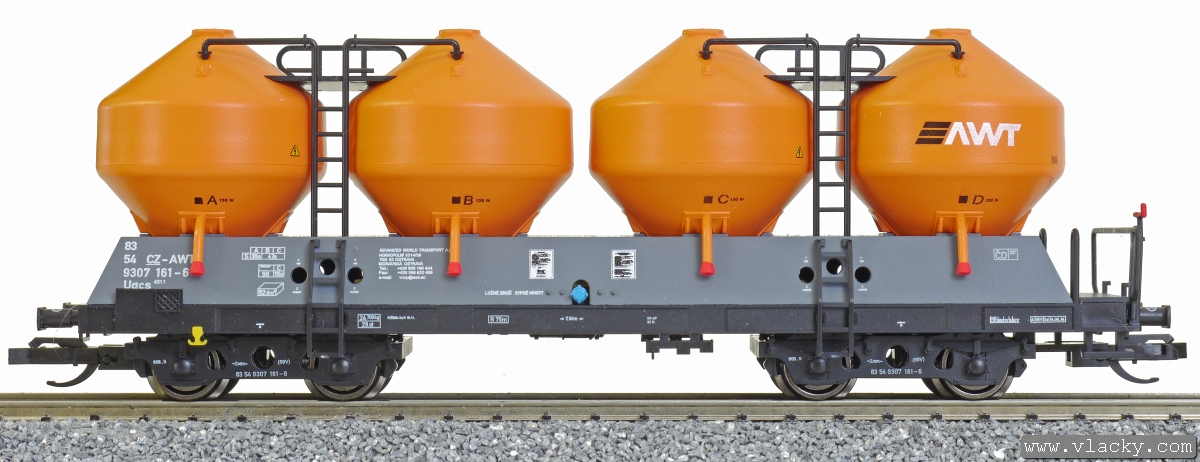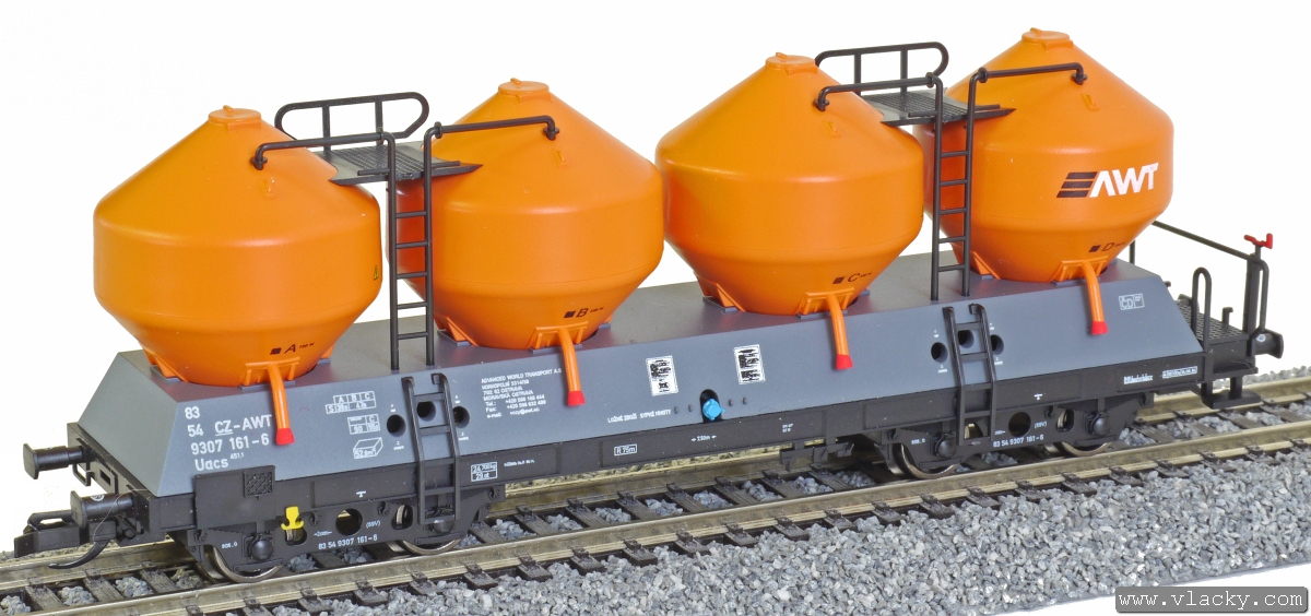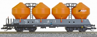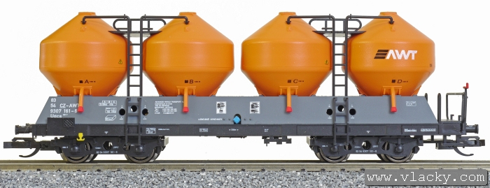 | nákladní samovýsypný vůz šedý s oranžovými nádobami s logem „AWT“ |