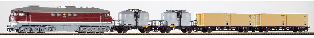 | set dieselové lokomotivy BR 130 a čtyř nákladních vozů |