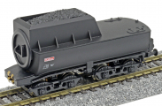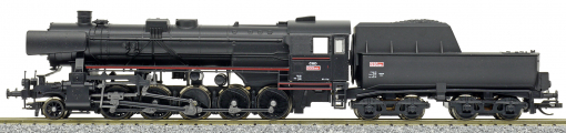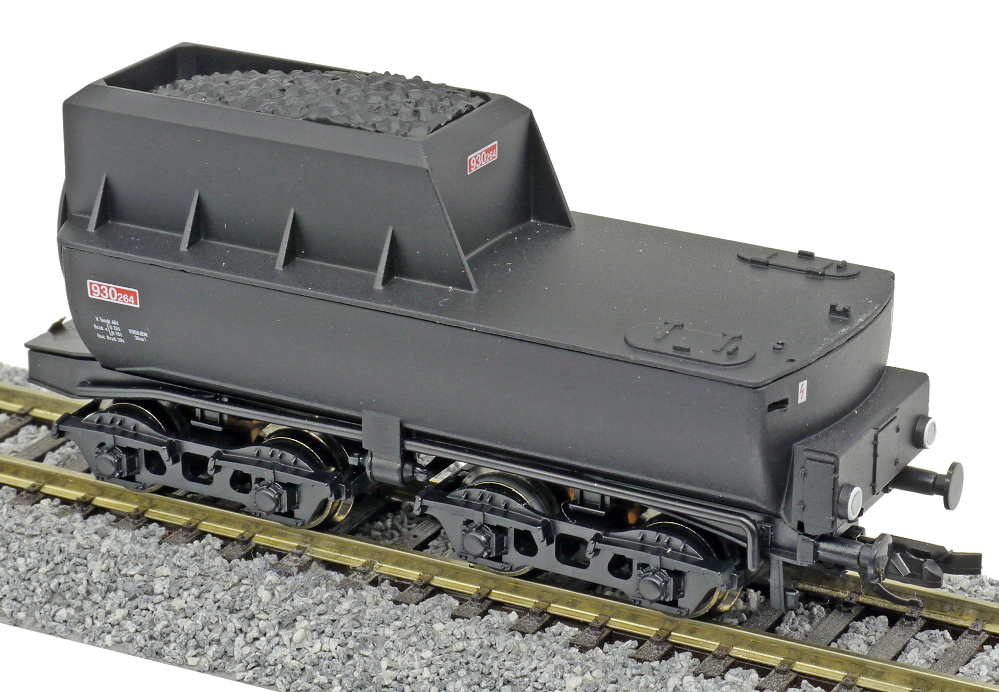 | parní lokomotiva černá s kouřovými plechy, černý pojezd, vanový tendr |