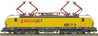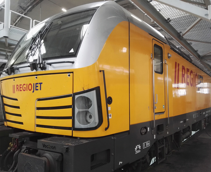| elektrická lokomotiva „Vectron“ v oranžových barvách RegioJet |