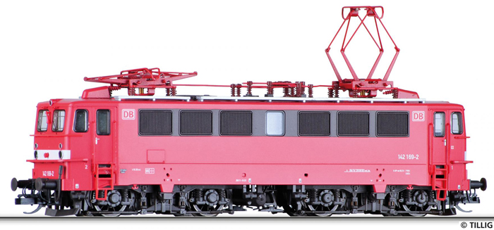 | elektrická lokomotiva červená, tmavě hnědý pojezd |
