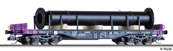 | plošinový vůz černý s růžovými čelníky a s nákladem |