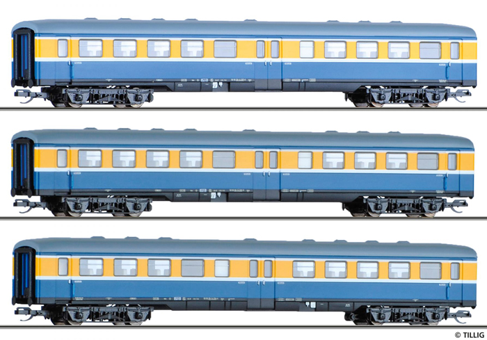 | set tří osobních vozů v barevném schematu „S-Bahn Leipzig“ |