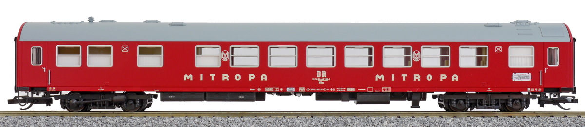 | jídelní vůz červený s šedou střechou „MITROPA“ |