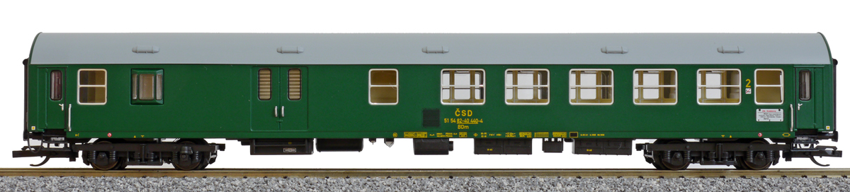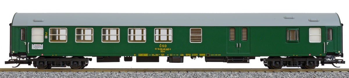 | rychlíkový vůz zelený s šedou střechou 2. tř. a zavazadlovým oddílem |