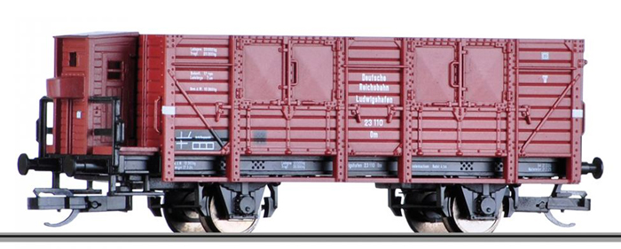 | otevřený nákladní vůz červenohnědý s brzdařskou budkou |