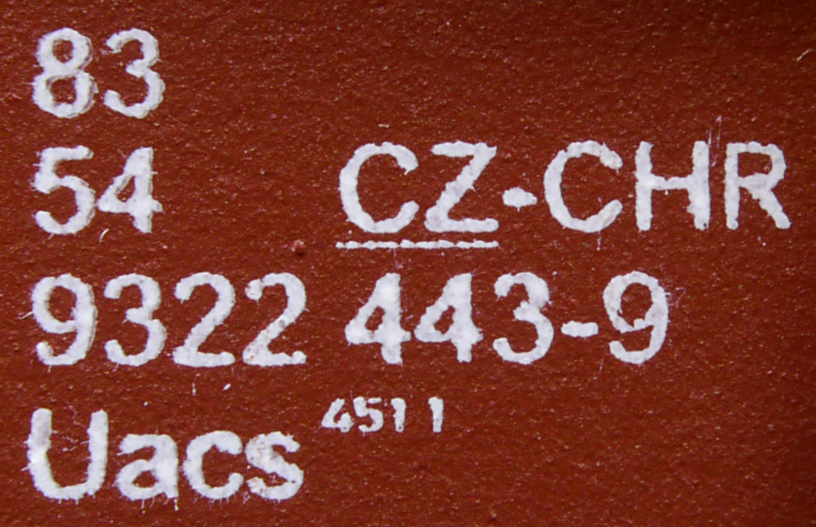 | • 83 54 9322 443-9 | → | nákladní, s podvozky, soukromý vůz, pro mezinárodní dopravu dle zvláštních úmluv |