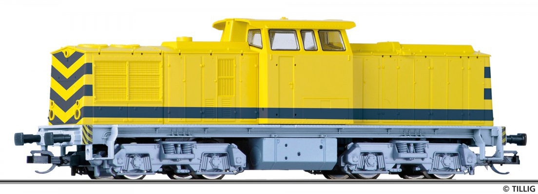 | dieselová lokomotiva žlutá s modrým pruhem, šedý pojezd |