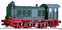 | dieselová lokomotiva zelená, šedá střecha, červený rám a pojezd |