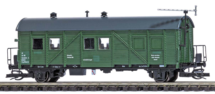 | pomocný osobní vůz do pracovního vlaku zelený s šedou střechou a anténou |