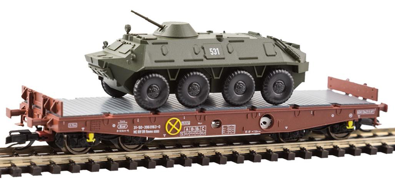 | plošinový vůz hnědý s nákladem bojového vozidla SPW60PB |