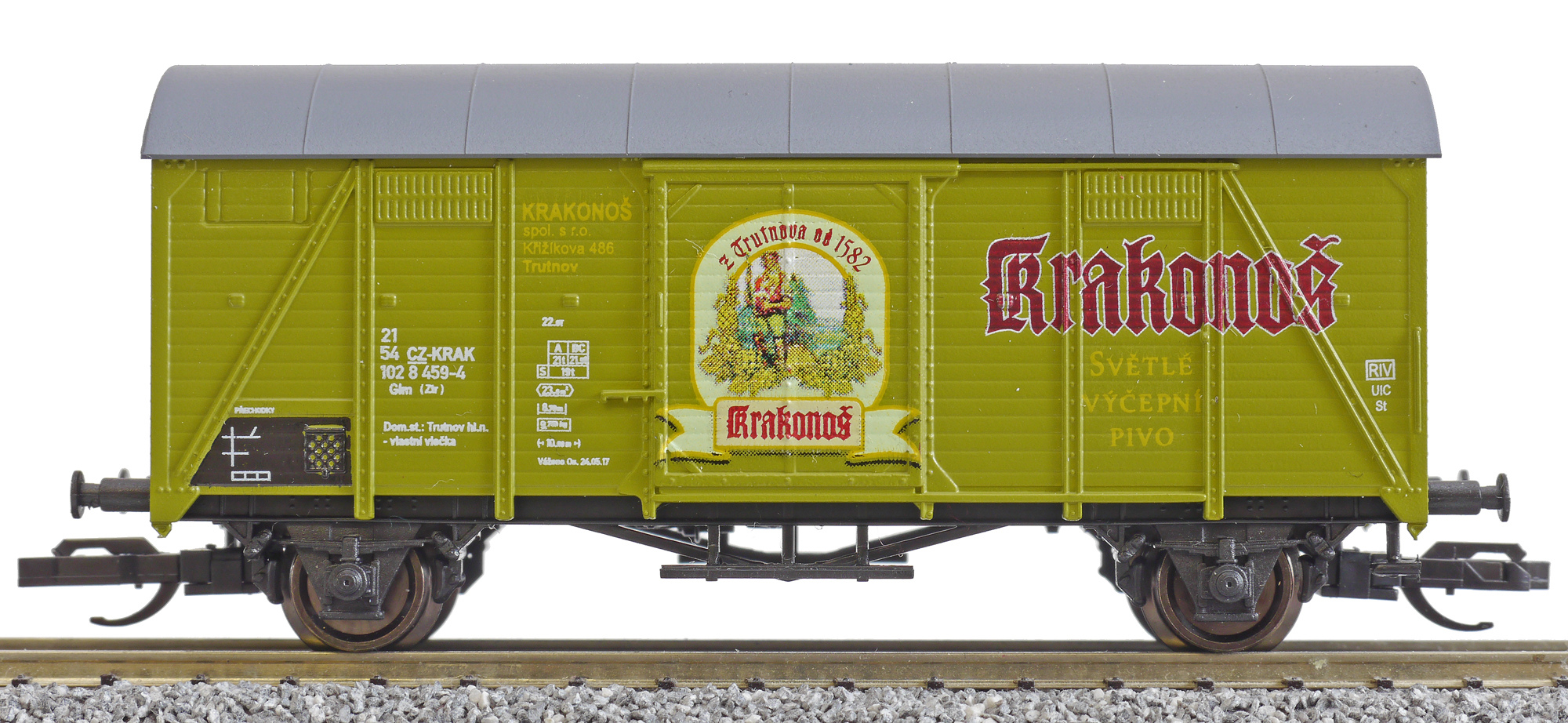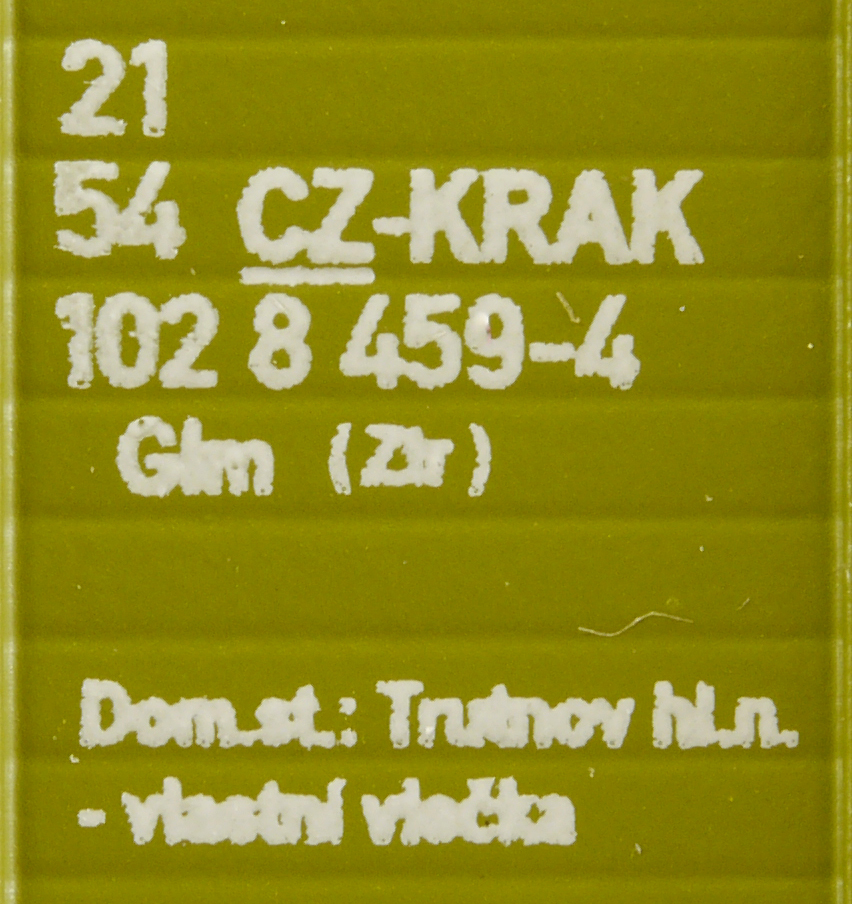 | • 21 54 102 8 459-4 | → | nákladní, nezávislé nápravy, pevný rozchod, ve vlastnictví železniční správy, RIV, PPV |