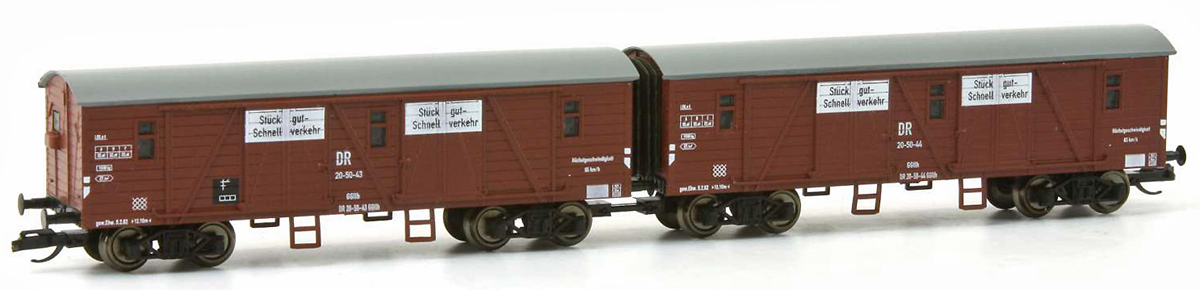 | dvojice krytých vozů Leig červenohnědých s šedou střechou |