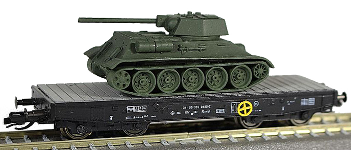 | plošinový nákladní vůz černý s nákladem tanku T34 |