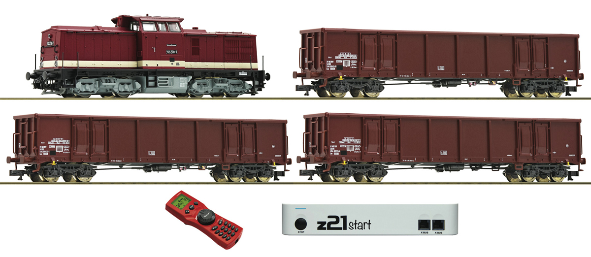 set dieselové lokomotivy a tří vysokostěnných nákladních vozů