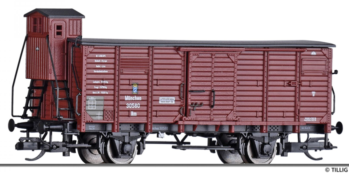 | krytý nákladní vůz červenohnědý s černou střechou a s brzdařskou budkou |