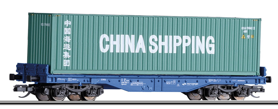 | nákladní vůz plošinový modrý ložený kontejnerem 40 ' |