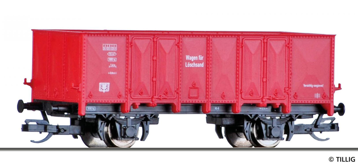 Popis   otevřený vůz červený s nákladem písku do požárního vlaku