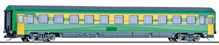 rychlíkový vůz v barevném schematu „Raabercity“ 1./2. tř.