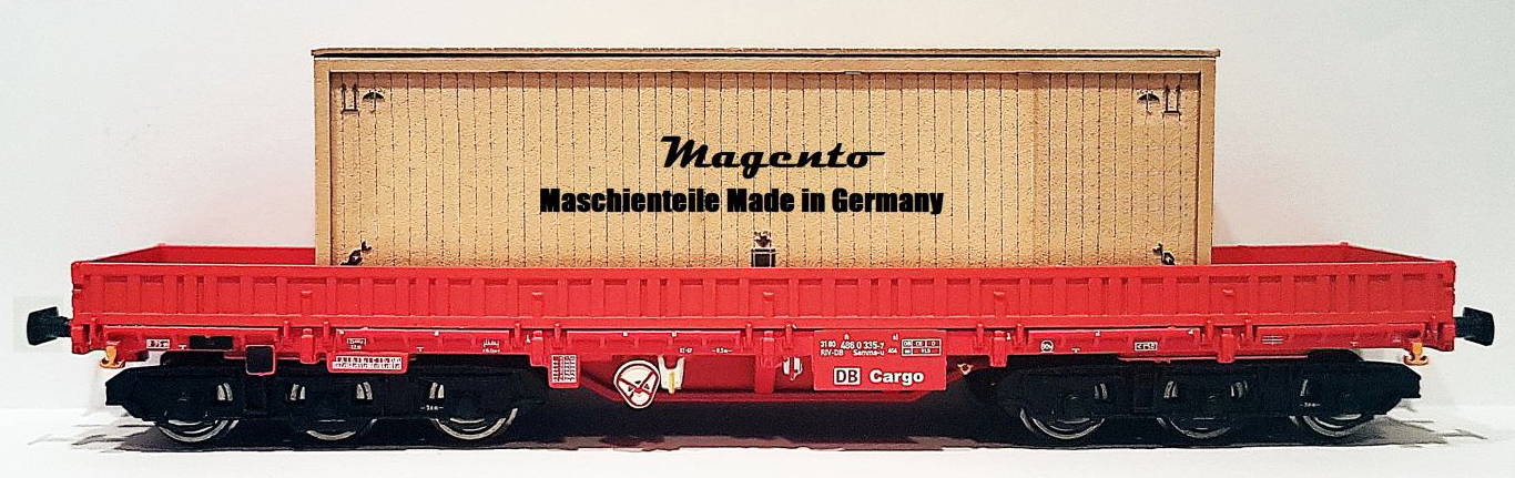 | nízkostěnný nákladní vůz červený s nákladem bedny „Magento” |