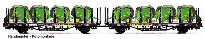 dvojdílný plošinový nákladní vůz červenohnědý s nákladem lisů na kulaté balíky