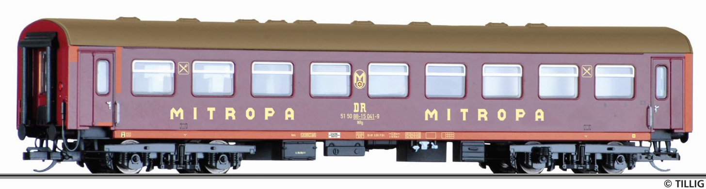 | jídelní vůz vínově červenýs opravnými fleky a s šedou střechou „MITROPA“ |