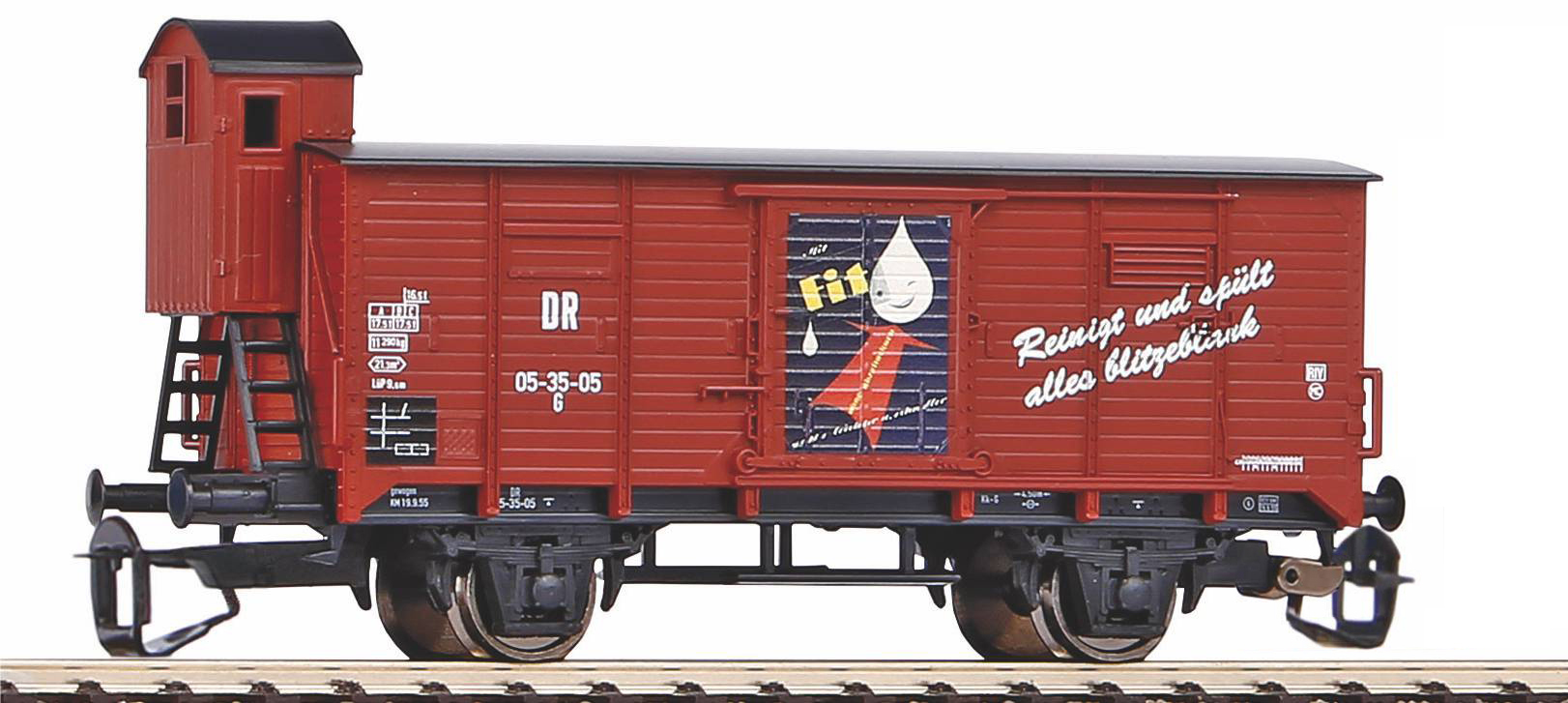 | krytý nákladní vůz červenohnědý s brzdařskou budkou „Fit“ |