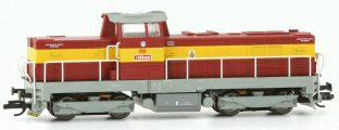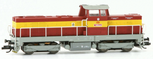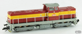 | dieselová lokomotiva červená s výstražným pruhem, šedá střecha, rám a pojezd |